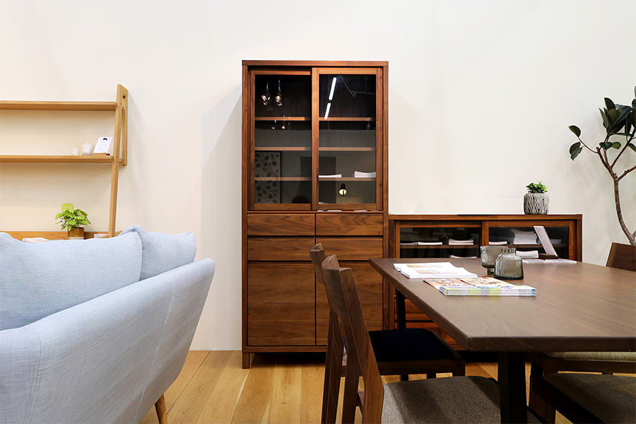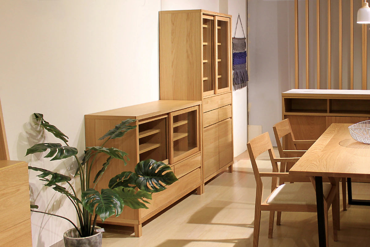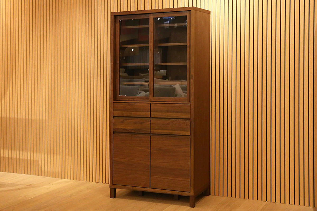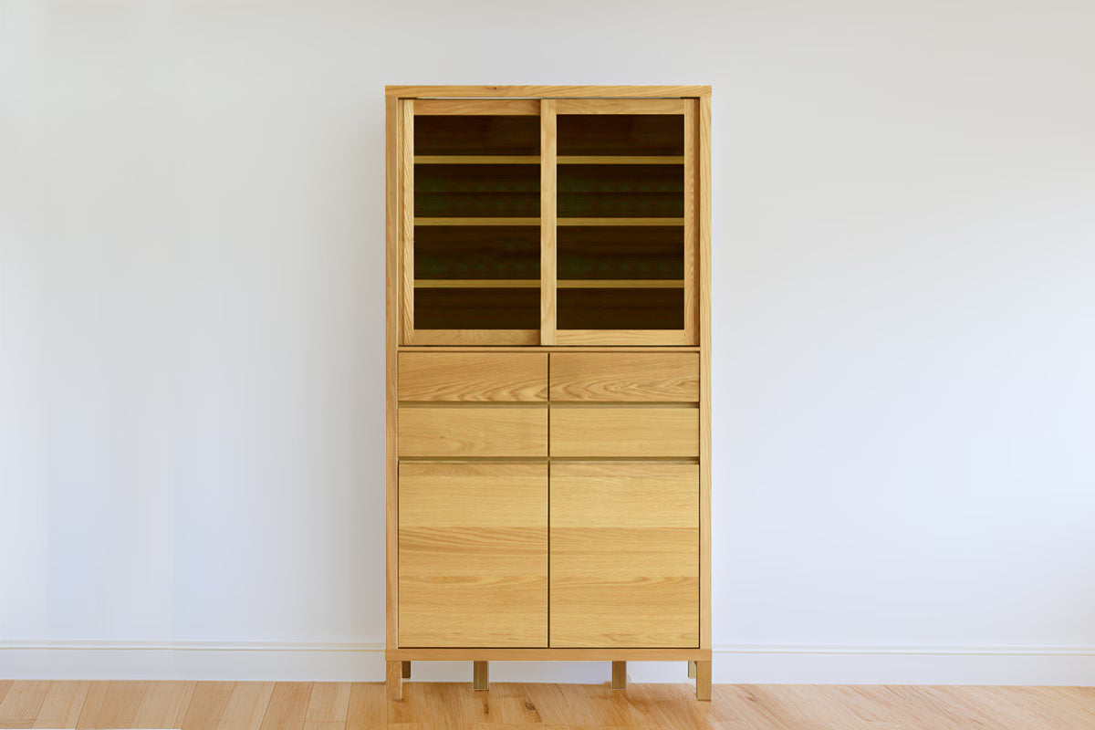 Thoughtfully designed for those who cherish their collection, the CANO serves as a "gallery for your tableware." The glass sliding doors allow you to display your favorite pieces as if they were art, while the wooden rails—crafted entirely from solid wood without metal parts—ensure a smooth, silent glide that maintains the cabinet’s organic feel. Every detail, from the hand-sculpted recessed handles to the sleek exterior, highlights the unique grain and tactile beauty that only authentic timber can provide.