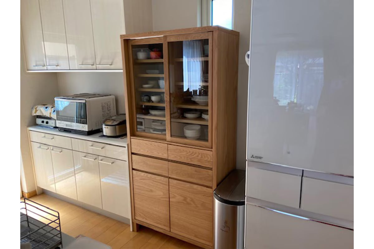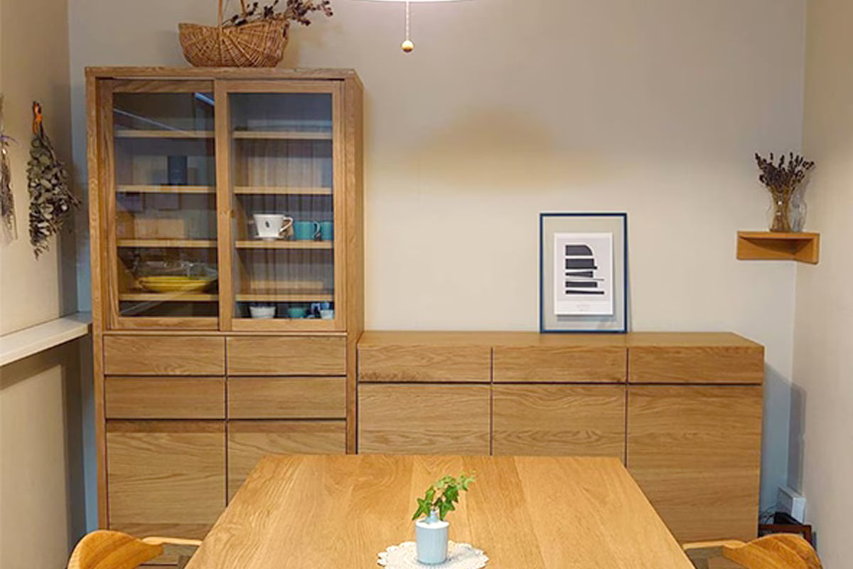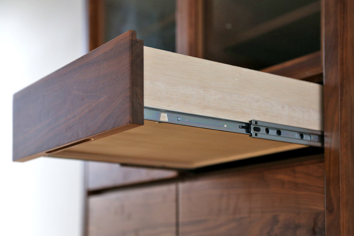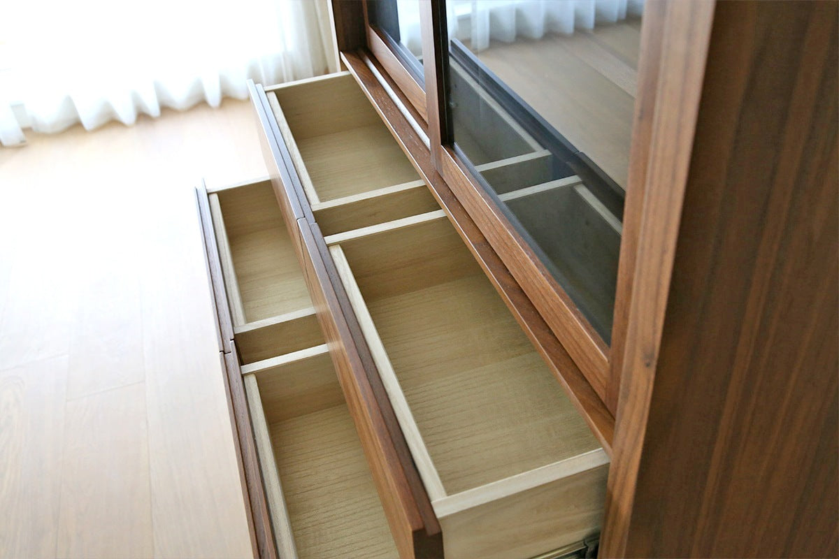 Thoughtfully designed for those who cherish their collection, the CANO serves as a "gallery for your tableware." The glass sliding doors allow you to display your favorite pieces as if they were art, while the wooden rails—crafted entirely from solid wood without metal parts—ensure a smooth, silent glide that maintains the cabinet’s organic feel. Every detail, from the hand-sculpted recessed handles to the sleek exterior, highlights the unique grain and tactile beauty that only authentic timber can provide.