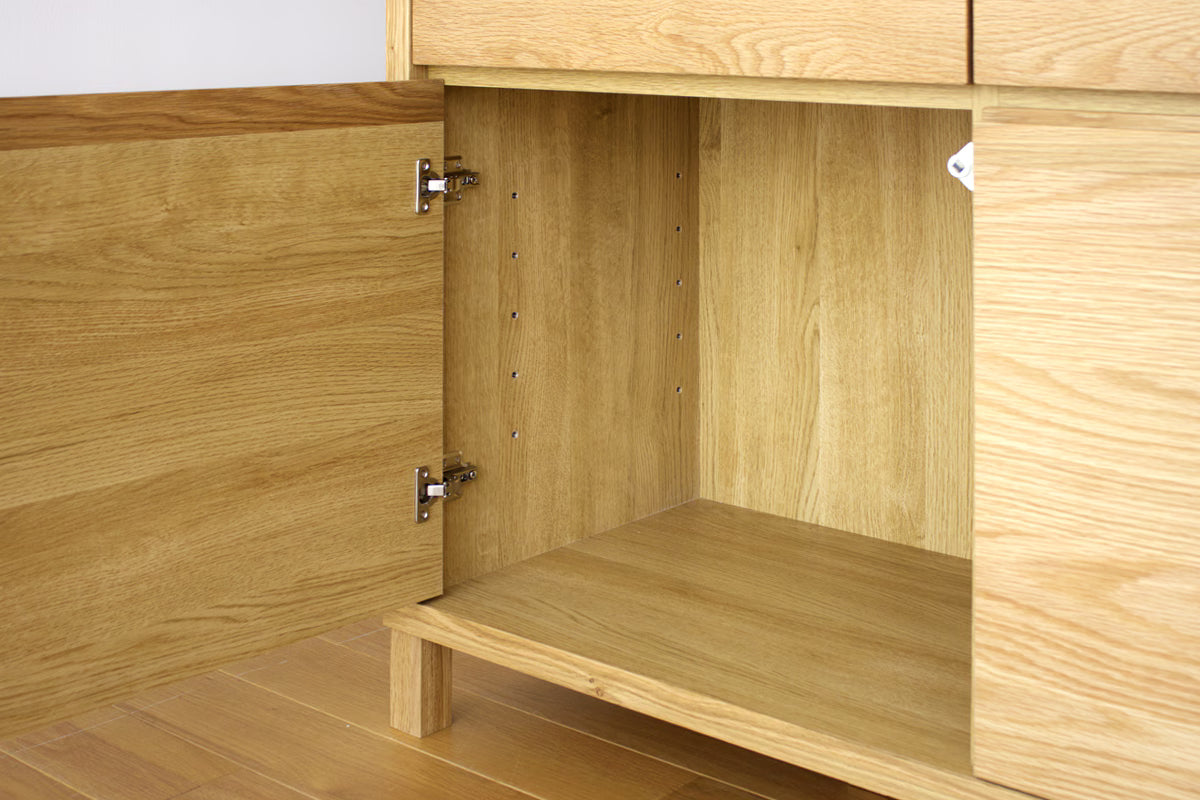 Functionality is integrated into every inch of the design. The central drawers feature full-extension slide rails for effortless access to cutlery and small essentials, while the interior storage includes four adjustable shelves with a 5-stage height system to accommodate everything from delicate wine glasses to larger serving platters. Even the back panel is finished with a high-quality decorative finish, allowing for flexible placement in open-concept rooms. The CANO Low Cabinet is more than just a cupboard; it is a durable, high-performance piece of furniture that honors the tradition of Japanese craftsmanship.