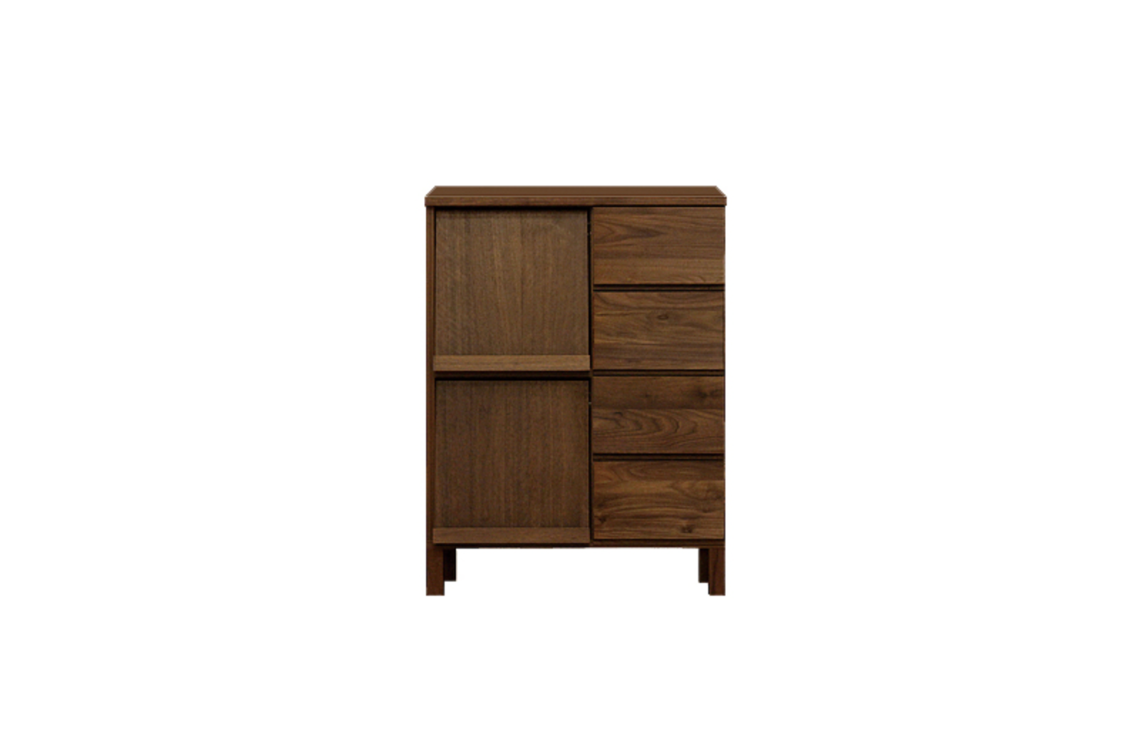 Functionality is at the heart of the LECCE, featuring a clever "visible and hidden" storage system. The innovative flap doors glide smoothly on internal rollers, allowing you to display your favorite magazines or vinyl records on the front ledge even while the doors are tucked away. For items you prefer to keep out of sight, the sturdy box-frame drawers are crafted from paulownia wood—a traditional material prized for its natural ability to regulate humidity and protect your belongings.