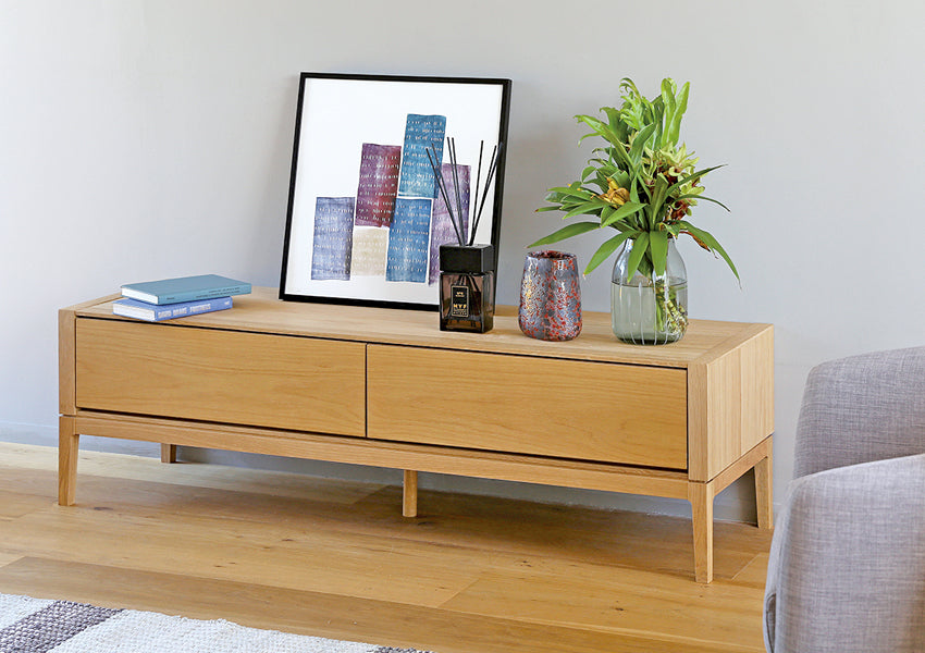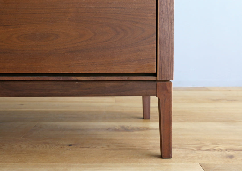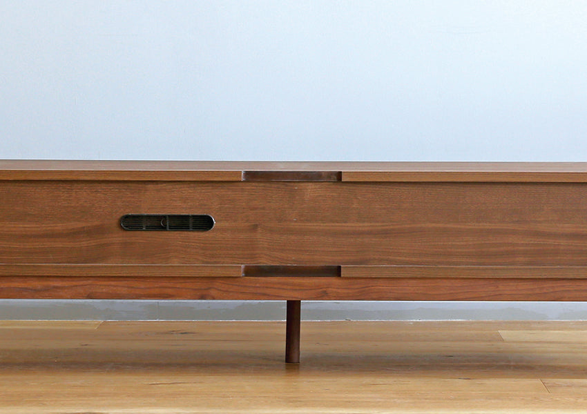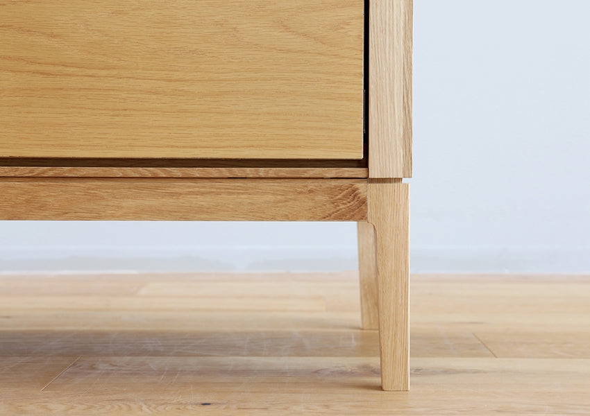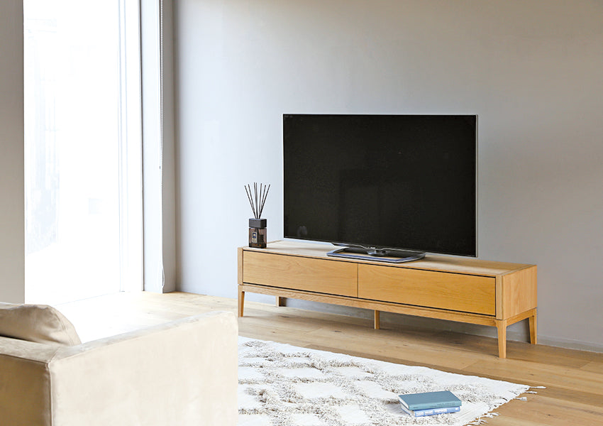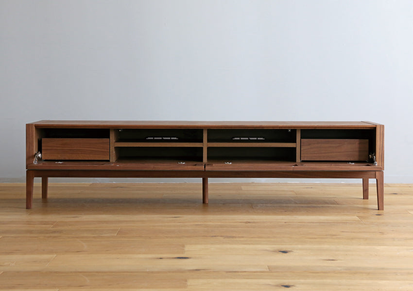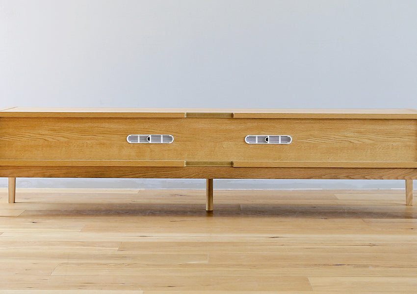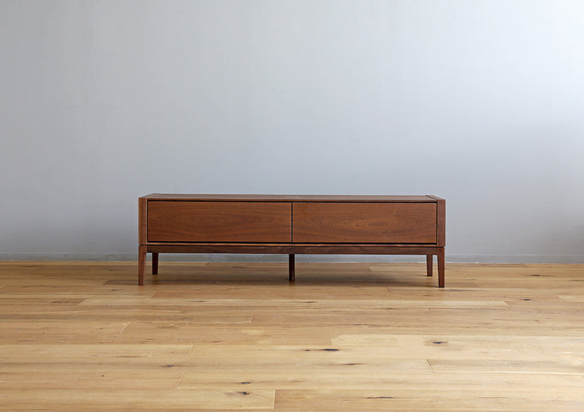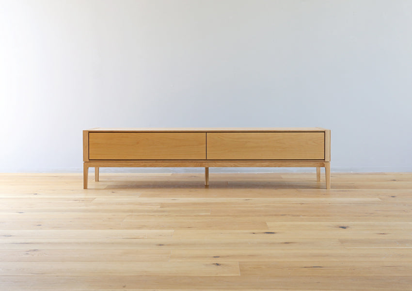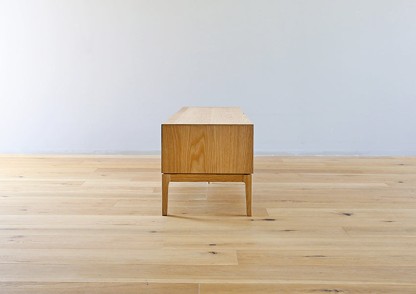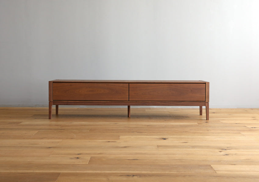 TAKANO MOKKOU - The MOL TV Console is a masterclass in modern minimalism, designed to highlight the raw, luxurious beauty of natural timber. By concealing storage behind a seamless facade of rich wood, this piece achieves a sophisticated presence that anchors your living space without overwhelming it. Crafted with a focus on tactile materiality, the console features a matte finish that preserves the organic feel of the wood, allowing you to enjoy the unique grain and natural aging process that only high-quality solid wood can provide. The silhouette is defined by an exquisite balance between a slender tabletop and wide side-frames, creating a sharp, clean aesthetic from every angle. Elevating this refined form are tapered solid wood legs standing at 20cm—a height meticulously chosen to enhance the stylish profile while remaining fully compatible with robot vacuum cleaners.