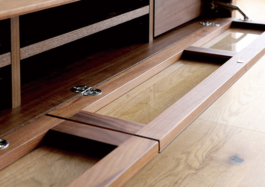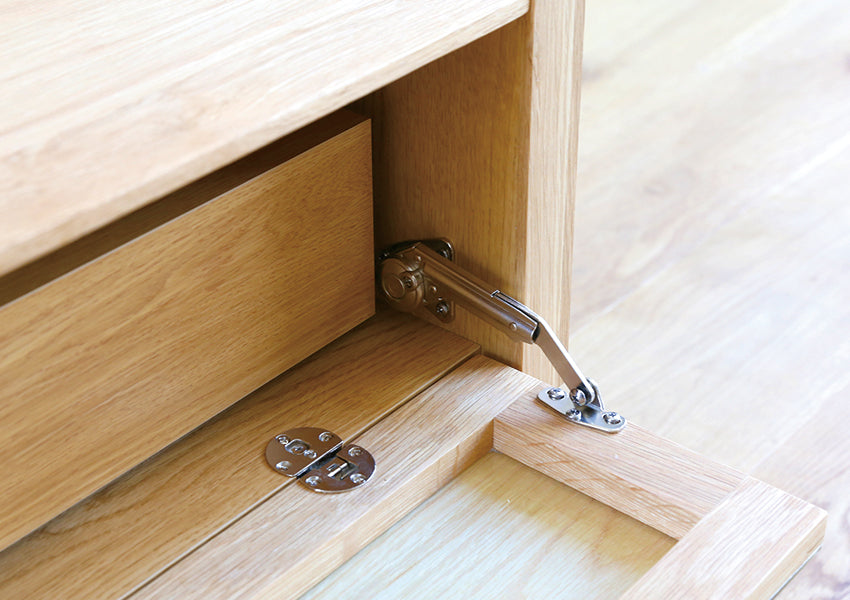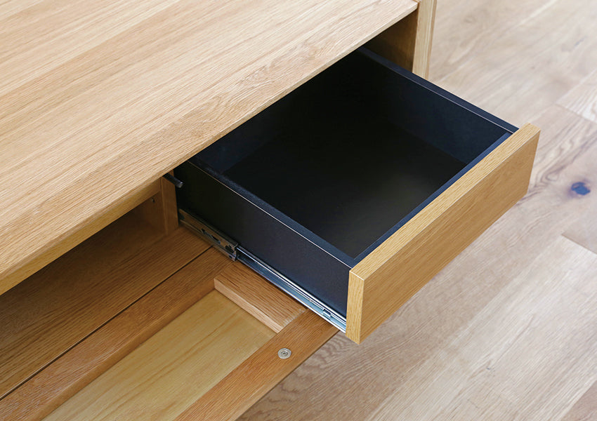 Beyond its striking appearance, the MOL TV Console is engineered with clever, hidden functionality that meets the demands of a modern home. The front flap door utilizes innovative "Veneer Glass" technology, where a thin layer of natural wood is bonded to glass; this allows the console to maintain a solid wood look while ensuring remote control signals pass through seamlessly. For a premium user experience, the push-to-open door is equipped with a slow-down stay mechanism to ensure it opens gently and safely. Inside, the unit offers a highly organized storage system featuring adjustable shelving and drawers with full-extension slide rails for effortless access to your media essentials.